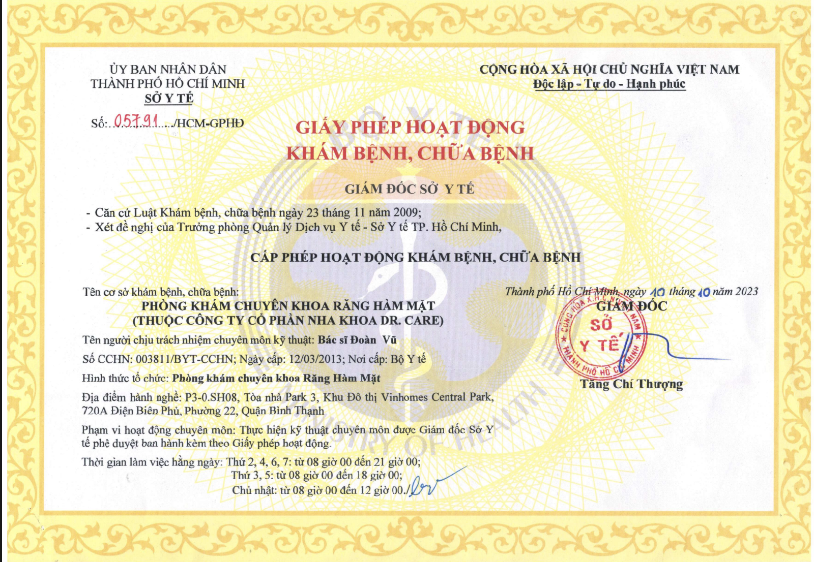 Giấy phép hoạt động phòng khám chuyên khoa răng hàm mặt (Thuộc công ty cổ phần nha khoa Dr. Care)